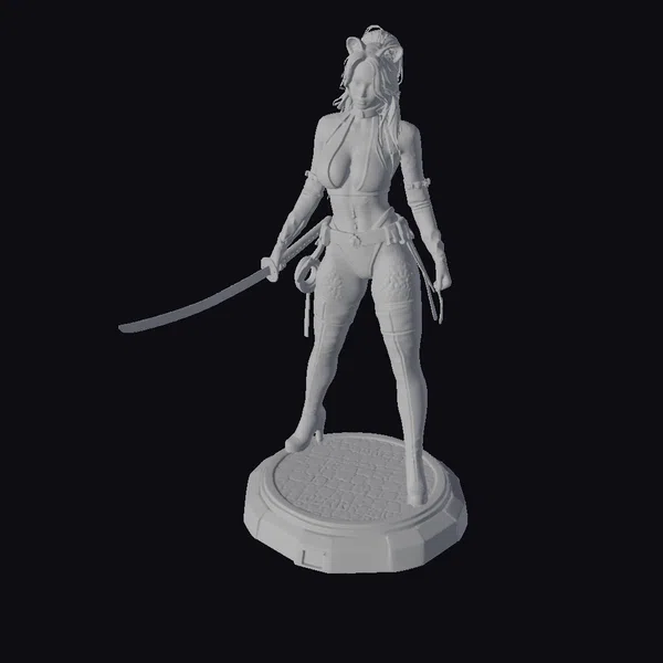 Gaze upon the Leopard Cat Warrior, a masterpiece of stylized fantasy art. She stands confidently on a sleek black base, her body a mesmerizing canvas of leopard print tattoos that seem to shimmer in the light. Her attire is a bold, black ensemble consisting of a bra, underwear, and thigh-high gloves, complemented by a matching choker and a headpiece that resembles cat ears. In her hand, she wields a long, slender sword, its presence both fierce and alluring. The intricate details, from the texture of her skin to the sheen on her sword, invite you to explore the depths of this 3D model. Perfect for projects that demand a touch of fantasy and sensuality, such as game development, animation, or virtual reality experiences.