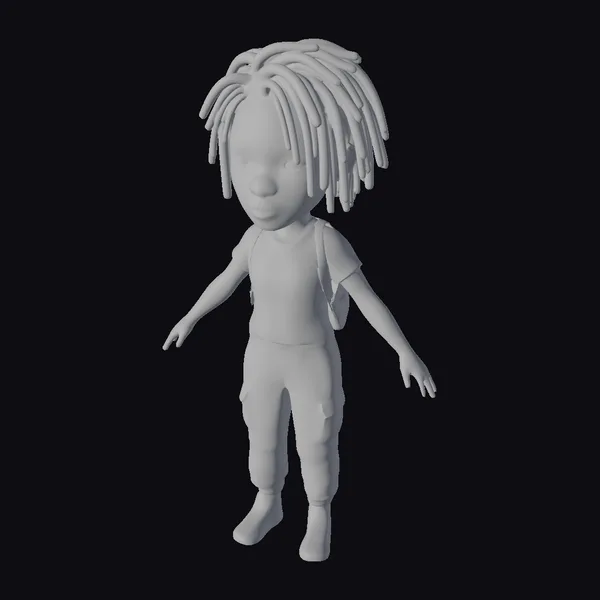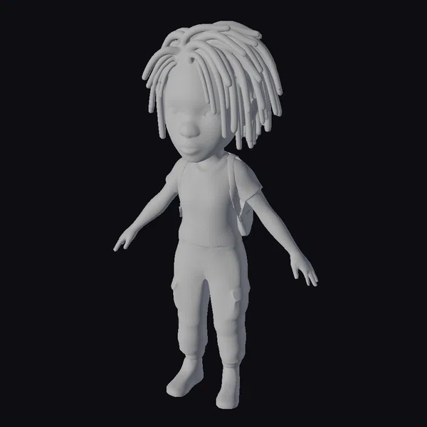 Detailed with care, this cartoon-style young boy model showcases a dynamic pose with outstretched arms, inviting interaction. His dreadlocks are meticulously textured, complemented by a soft, casual outfit consisting of a white t-shirt, green cargo pants, and vibrant red sneakers. A brown backpack is slung over his shoulders, suggesting a readiness for exploration. The model’s high-quality textures and realistic proportions make it suitable for various applications, including game development, animation projects, 3D printing, and virtual reality experiences. The character’s youthful and adventurous vibe can enhance any scene or narrative.