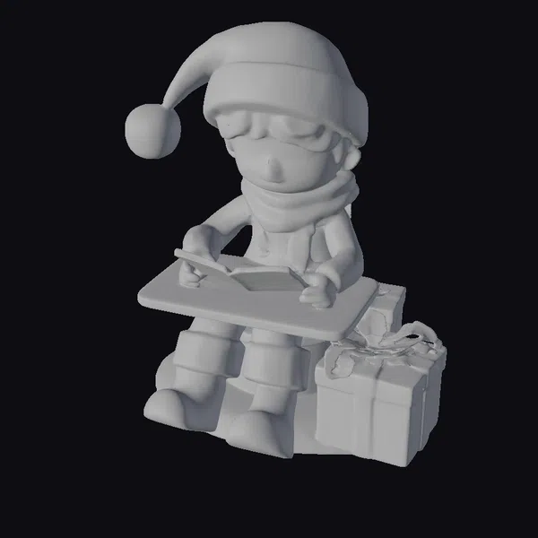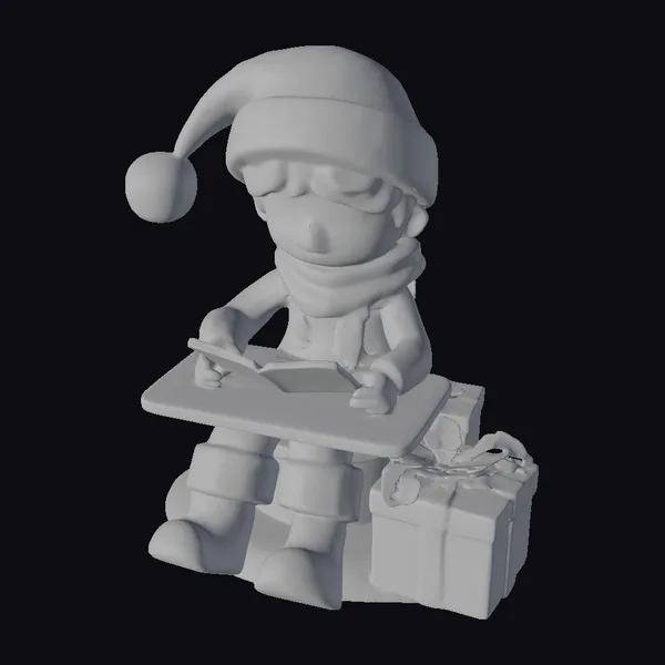This delightful 3D model captures a moment of holiday magic with a little Christmas elf engrossed in writing. The elf sits on a stack of gifts, with a red and white present prominently displayed beside them. The elf’s attire is meticulously detailed, from the soft, fluffy texture of the Santa hat’s trim to the intricate folds of the brown scarf. The elf’s blonde hair is styled in a cute, tousled look, and their facial features are warm and inviting. The model is perfect for animations, games, or any project requiring a festive touch. Its stylized yet detailed appearance ensures it will add a cheerful vibe to any scene.