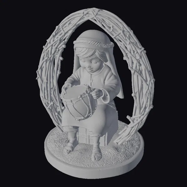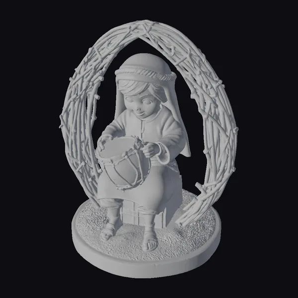 Imagine a serene scene where music meets spirituality, captured in this delightful little drummer boy figurine. The young boy, adorned in a simple yet elegant white robe and sandals, sits comfortably on a wooden block, engrossed in playing a drum that transitions from warm orange to yellow hues. The drum’s metal accents catch the light, adding a touch of realism. The figurine is set against a beautifully crafted, oval-shaped arch made of intertwined twigs, symbolizing a natural, earthy ambiance. The base of the model is thoughtfully designed with patches of green moss on sandy ground, enhancing its overall aesthetic appeal. This model is versatile and can be used in various contexts, such as game development, 3D printing, virtual reality experiences, animations, or as a decorative piece in design projects. Its stylized yet detailed appearance makes it a captivating addition to any creative work.