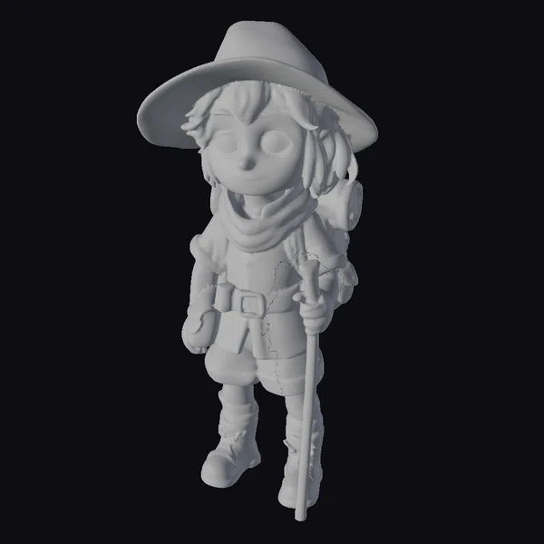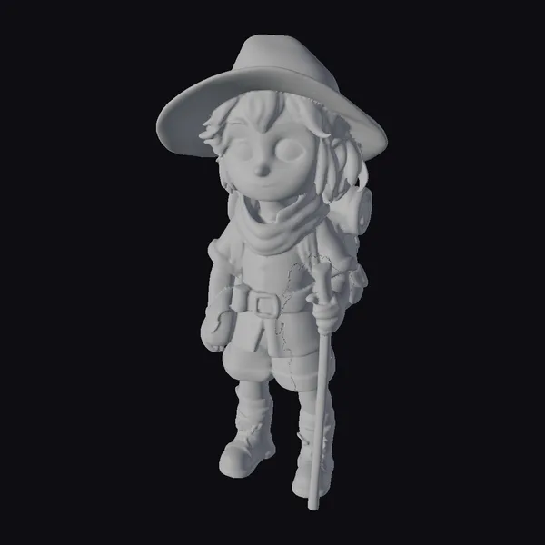 Standing confidently with her walking stick in hand, this little explorer girl exudes a sense of curiosity and adventure. Her cartoon style design features a distinctive green hat and matching scarf, complemented by a practical outfit consisting of a short-sleeved shirt, shorts, and sturdy boots. The brown backpack strapped to her back suggests she’s ready for a journey. The model’s pose and facial expression convey a sense of determination and friendliness. Her large green eyes sparkle with excitement, inviting the viewer to join her on an adventure. This model would be perfect for use in animations, games, or 3D printing projects that require a charming and adventurous character.