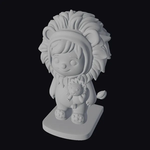 Detailed with precision, the lion costume is a marvel of textured design, from the soft, fuzzy mane to the patterned base that resembles a savannah landscape. The boy’s brown hair peeks out from under the hood, adding a touch of realism to the otherwise fantastical outfit. The little lion he holds is a perfect miniature replica of his costume, complete with its own tiny mane. This model is perfect for animation, games, or print projects needing a dose of cuteness and whimsy. The pose is dynamic yet stable, showcasing the character in a friendly stance.