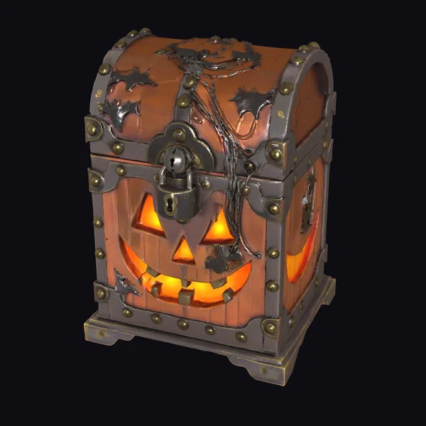 Positioned at a dynamic angle, the chest showcases its intricately designed wooden body, wrapped in metal bands and studded with rivets, evoking a sense of ancient, mystical power. The jack-o’-lantern face, softly illuminated from within, casts an orange glow, highlighting the chest’s curved lid and robust metalwork. A substantial, old-fashioned lock and chain add to its mystique. Ideal for use in games, 3D printing, VR/AR experiences, animation, or design projects seeking a touch of Halloween magic.