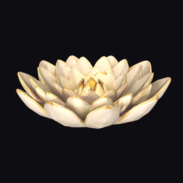 Crafted with meticulous attention to detail, this stunning ceramic bowl is meticulously shaped like an open lotus flower, comprising multiple distinct petal-like segments that appear to gently unfold. The petals, a soft white hue, are accentuated by thin, slightly raised golden lines that add a touch of luxury and sophistication. The bowl’s interior and base are subtly textured to mimic the natural curves of a lotus flower. The golden accents catch the light, imbuing the piece with a sense of warmth and inviting ambiance. Ideal for use in games, 3D printing, VR/AR experiences, animation projects, and design visualizations, this model brings a touch of serene beauty to any creative endeavor.