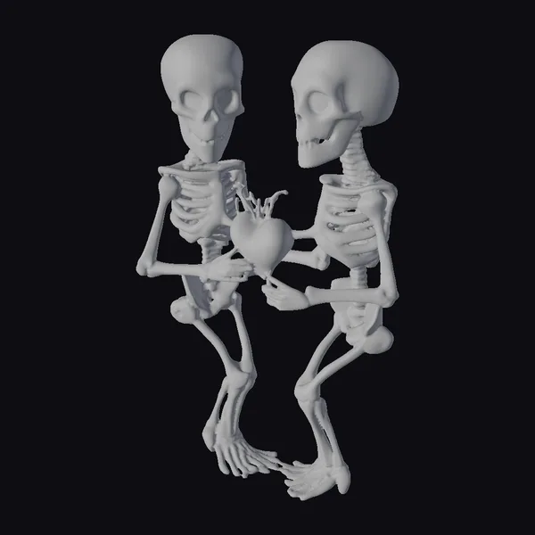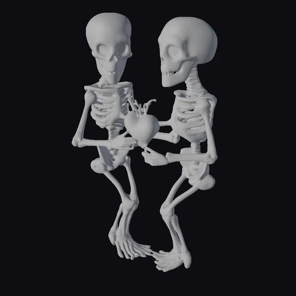 Detailed examination reveals the intricate texture of the skeletons’ bones, with subtle shading that gives them a lifelike appearance despite their undead nature. The heart, with its dynamic blood vessels, seems to pulse with life. The skeletons’ pose, with one slightly bent knee and arms wrapped around the heart, conveys a deep sense of connection. This model is perfect for projects requiring a touch of dark romance or whimsy, such as animations, games, or designs that explore themes of love and mortality. Its stylized yet detailed appearance makes it versatile for various creative applications.