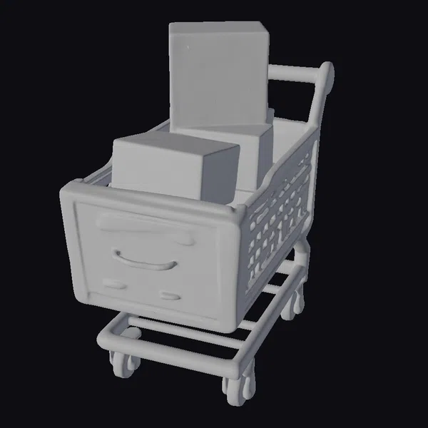 In a dynamic pose, the low-poly shopping cart is filled to the brim with an assortment of software boxes, each one meticulously labeled with icons representing various digital products. The cart’s metal frame gleams in shades of silver and red, complemented by sturdy black wheels. The boxes themselves are a riot of color, stacked haphazardly to create a visually appealing arrangement. Textures are smooth and stylized, with clean lines defining the cart’s mesh structure. As a 3D model, it’s perfect for projects requiring a quirky, modern aesthetic, such as animations, games, or architectural visualizations. Designers and artists will appreciate the model’s unique blend of digital and real-world elements.