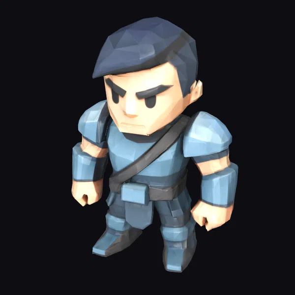 Detailed with precision, this low-poly warrior model showcases a blend of functionality and aesthetic appeal. His blue armor, complete with shoulder pads, arm guards, and a utility belt, suggests a fusion of medieval and futuristic elements. The character’s facial features are defined by sharp, angular lines, contributing to his determined look. He stands in a powerful stance, fists clenched, ready to face any challenge. This model’s stylized appearance makes it suitable for game developers, animators, and designers looking for a character that combines a modern, graphic aesthetic with the essence of a classic warrior. Its low-poly design ensures ease of use in various applications, from video games and animations to virtual reality experiences and architectural visualizations.