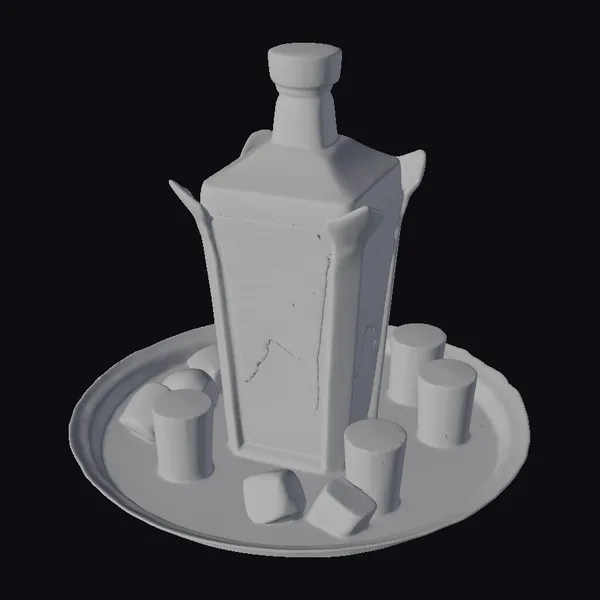 Positioned centrally on a platter, the decanter stands tall with its stopper securely in place, showcasing a rich amber liquid within. The decanter’s body is a masterclass in elegance, with a square base that tapers into a narrower, rounded top, all adorned with intricate etchings that catch the light. Six glasses, each uniquely detailed with a mix of clear and gold accents, surround the decanter, creating a visually appealing arrangement. The entire set rests on a circular platter with a metallic sheen, adding to the overall opulence. The combination of gold, silver, and the warm glow of the amber liquid evokes a sense of luxury and festivity, perfect for special occasions or as a statement piece in any setting. Ideal for use in games, 3D printing, VR/AR experiences, animation projects, or design visualizations, this model brings a touch of high-end sophistication to any creative endeavor.