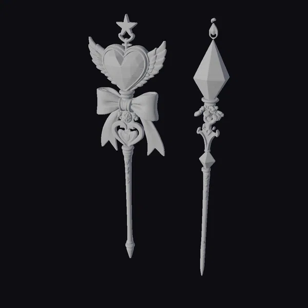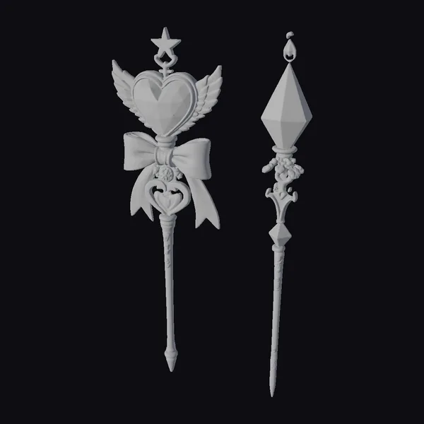 These two magical scepters are meticulously crafted with attention to detail, featuring heart-shaped crystals, winged motifs, and ornate gold handles. One scepter boasts a vibrant pink bow and a star at its apex, while the other showcases a pyramid-shaped crystal and blue gemstones. Their elaborate designs make them perfect for use in fantasy games, animations, or 3D printing projects. The scepters’ proportions and textures are finely tuned to create a realistic and captivating appearance.