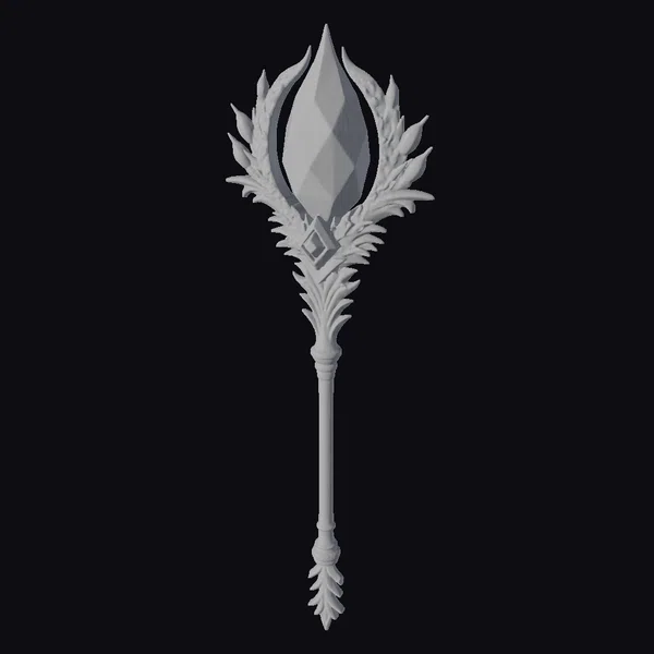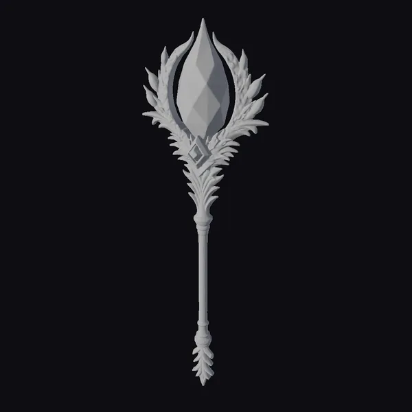 Perched atop a slender gray handle, a radiant purple gemstone shines brightly, encircled by a delicate arrangement of copper-colored leaves that appear to be bursting forth from the staff. Two small, teardrop-shaped gemstones in a soft blue-green hue add a touch of elegance to the staff’s design. The handle itself is embellished with additional leaf-like details, creating a sense of continuity and harmony. This stunning magical staff would be perfect for use in games, 3D printing, VR/AR experiences, animation, or design projects, transporting users to a world of fantasy and magic.