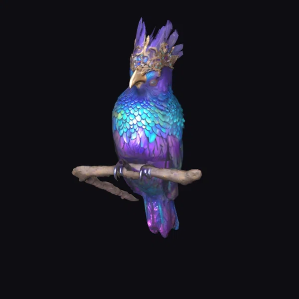 The majestic jewel bird sits poised on a sturdy branch, its body a dazzling array of iridescent feathers that shift between purple, blue, and gold in the light. Its head is adorned with a glittering crest, studded with jewels that catch the eye, while its beak shines with a subtle golden glow. The bird’s plumage appears almost scale-like, with each feather meticulously detailed to create a sense of texture and depth. As it gazes forward, its eyes seem to hold a quiet wisdom, as if guarding ancient secrets. This stunning creature would be a crowning jewel in any fantasy world, bringing a touch of magic to games, animations, or designs. Its intricate details and vibrant colors make it perfect for projects requiring a high level of realism and visual impact.