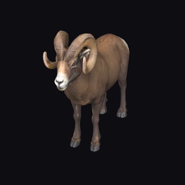 In a powerful stance, the majestic mountain ram faces forward, its large, curved horns sweeping back from its head like a natural crown. The detailed texture of its brown fur, lighter on the muzzle and darker on the legs, gives the model a lifelike appearance. The ram’s eyes are calm and alert, adding to its majestic demeanor. Ideal for use in wildlife animations, games, or as a detailed addition to outdoor scenes, this model brings a touch of the wild into any 3D environment. Its realistic proportions and detailed features make it perfect for high-quality renderings, animations, or 3D printing.