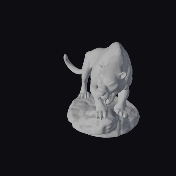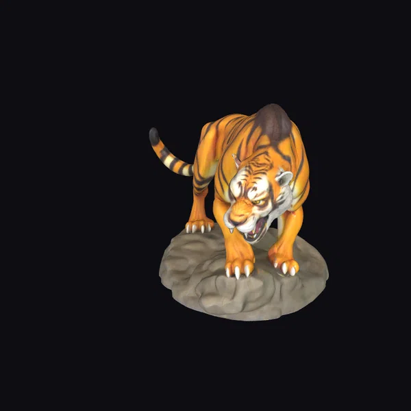Perched on a weathered rock, this magnificent saber tooth tiger appears poised to spring into action. Its body is a masterpiece of muscular definition, covered in a thick layer of orange fur adorned with dark, expressive stripes. The tiger’s eyes burn with a fierce inner light, and its mouth is open, revealing long, razor-sharp teeth. The claws on its paws are equally impressive, sharp and white, ready to tear through any obstacle. The rock base adds a sense of realism, with detailed textures that suggest rugged terrain. This model is perfect for use in games, 3D printing, VR/AR experiences, animation, and design projects where a touch of prehistoric ferocity is needed.