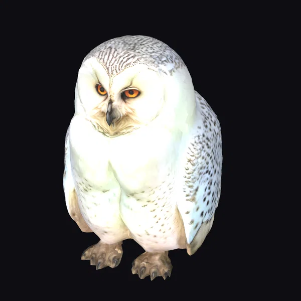 The majestic white owl stands proudly, its body angled slightly forward as if about to take flight. Its head is rounded, with a distinctive white and brown speckled pattern on the forehead and top. The eyes, a vibrant orange, seem to gleam with a sharp intelligence. The owl’s plumage is predominantly white, with brown spots adorning the wings and body, while the talons are a sturdy brown. The model’s detailed feathers and lifelike posture make it perfect for use in games, 3D printing, VR/AR experiences, animation, and design projects. The realistic style and serene yet intense mood of the owl bring a touch of wild elegance to any project.