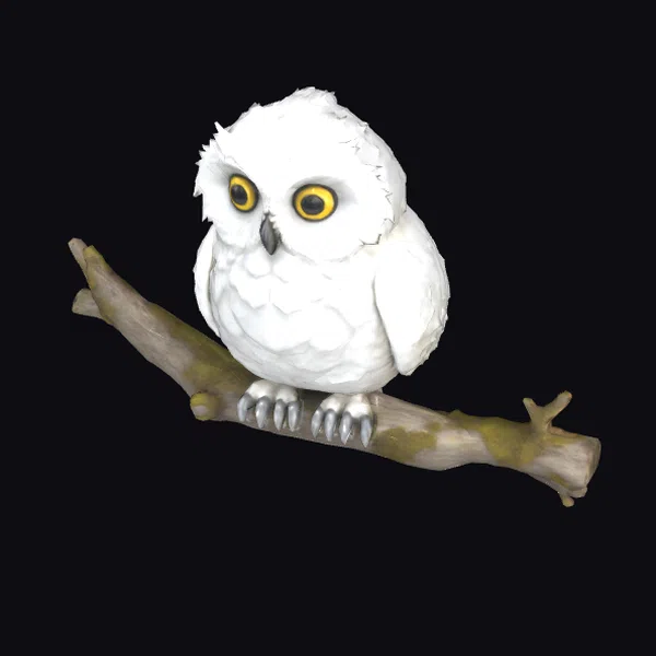 The majestic white owl sits gracefully on a branch, its body a beautiful rendition of fluffy white feathers with meticulous detailing. The owl’s large, round eyes are a vibrant yellow with black centers, giving it a curious and alert demeanor. Its small, black beak and sharp, gray talons are also finely detailed. The branch, with its textured bark and natural knots, provides a sturdy perch for the owl. This model is perfect for use in animations, games, or virtual reality experiences where a realistic yet charming avian character is needed. Its high level of detail makes it suitable for close-up shots or scenes where the owl is a focal point.