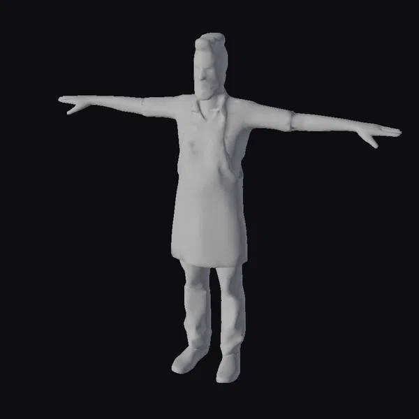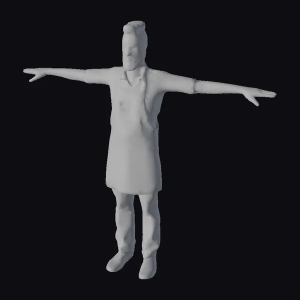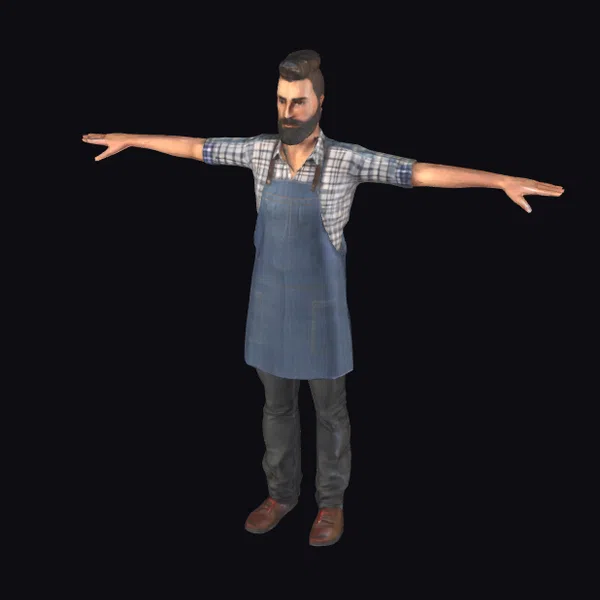 Detailed from head to toe, this 3D model of a male barista showcases exceptional detail. He sports a stylish denim apron over a blue and white plaid shirt, paired with dark jeans and brown shoes. His brown hair is styled in a trendy, slightly tousled look, and his beard is neatly trimmed. Standing with arms outstretched, he exudes a sense of friendliness and approachability. This model is perfect for various applications, including game development, animation projects, virtual reality experiences, and architectural visualizations where a human element is needed. Its high level of detail, from the texture of the apron to the expression on his face, ensures it can be used to create realistic and engaging scenes.