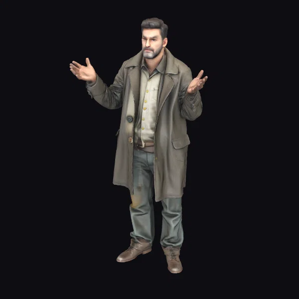 In a poignant stance, this male refugee character is captured in a T-pose, exuding a sense of vulnerability and determination. His rugged appearance is meticulously detailed, from the weathered and patched coat to the torn and worn trousers, complemented by a simple scarf and sturdy boots. The character’s facial features and hands are crafted with precision, showcasing a high level of realism. The full PBR textures add depth and realism, making this model suitable for various applications, including game development, animation, and virtual reality experiences.
