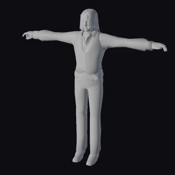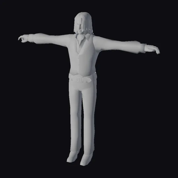 Standing tall with arms outstretched, this 3D model of a man in formal attire exudes confidence and style. His long, dark hair frames a well-defined face, complemented by a neatly groomed beard and mustache. The model’s outfit is meticulously detailed, from the patterns on his vest to the buckle on his belt. The realistic texture and pose make this model versatile for use in games, 3D printing, VR/AR experiences, animation, and design projects. The high level of detail, especially in the facial features and attire, ensures a lifelike representation.