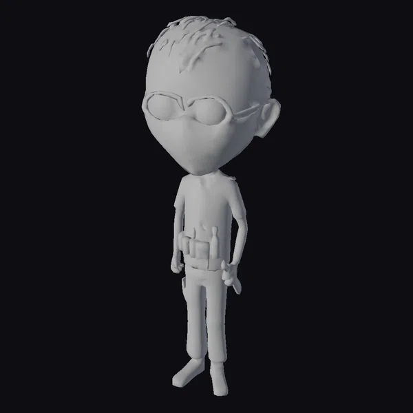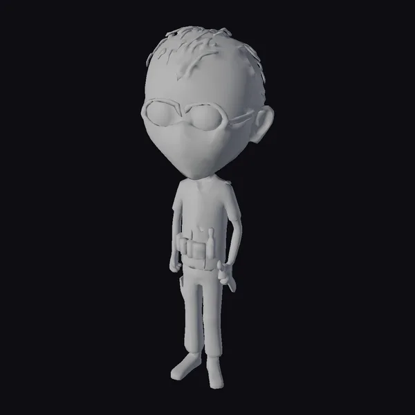 Detailed with a stylized approach, this character features a bright green mask covering his lower face, complemented by short, stylish glasses and a distinctive outfit consisting of a brown and black shirt, gray pants, and dark shoes. The character’s pose and facial expression convey a sense of casual readiness. The model’s unique blend of style and detail makes it suitable for various applications, including games, animations, and virtual reality experiences, where a character with a distinct personality is needed.