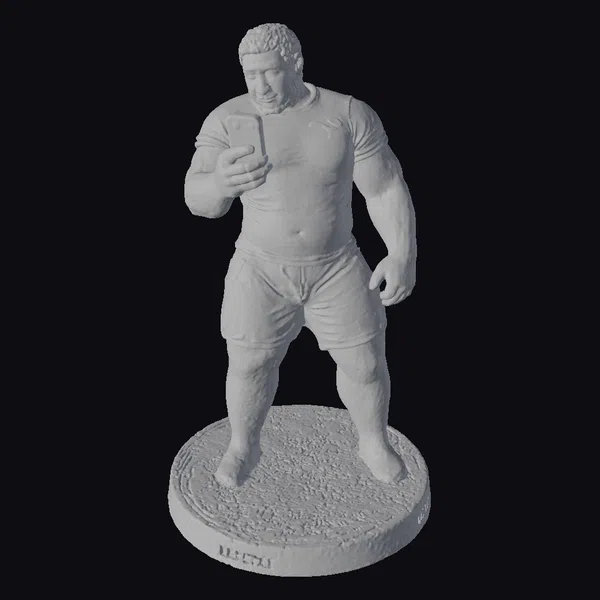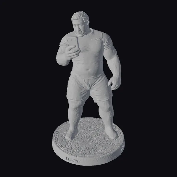 This meticulously crafted figurine depicts a muscular man with a beard, clad in a white rugby shirt and shorts, standing on a textured yellow grass base. His attention is fixed on the cellphone in his hand, his facial expression a mix of curiosity and concentration. The model’s realistic style is evident in its detailed anatomy, from the rugged texture of his skin to the intricate design of his rugby attire. The figurine’s pose, with one hand casually resting by his side, adds a sense of relaxed confidence. The yellow grass base, encircled by a sleek gray border, completes the scene. This model is perfect for projects requiring a realistic character with a sports theme, suitable for use in games, 3D printing, VR/AR experiences, animation, and design applications.