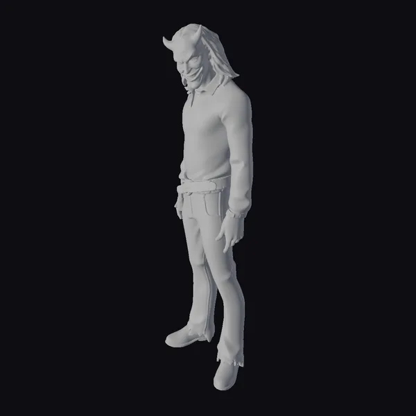 Detailed with precision, this stylized humanoid figure presents a compelling sight. The green mask, adorned with a horn, draws immediate attention, complemented by the character’s dark hair and attire. The black clothing, complete with a brown belt, adds to the mystique. The pose, with hands by the sides and legs slightly apart, suggests readiness or vigilance. Textures and lighting interplay to create a captivating visual effect. Ideal for projects requiring a fantasy or sci-fi character, such as games, animations, or virtual reality experiences.
