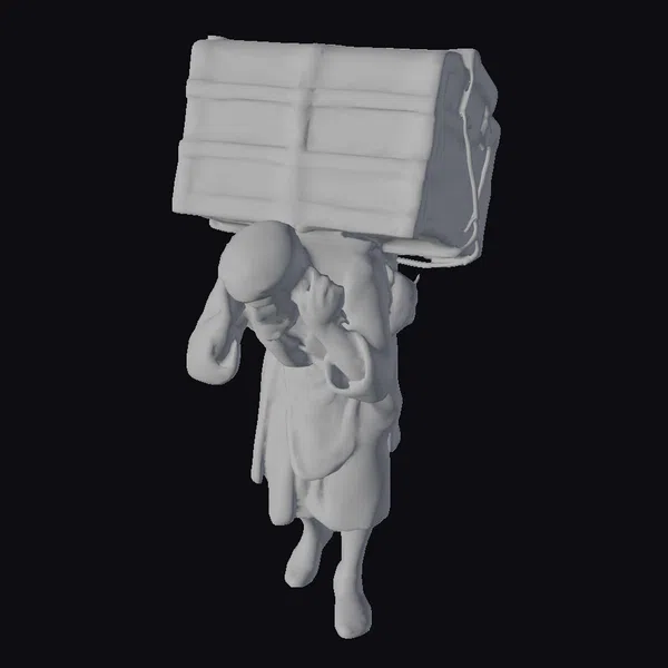 Rendered in exquisite detail, the man is captured in a moment of physical strain, his facial muscles tense and his hands grasping the edges of the crate for support. The wooden crate, secured with metal bands and a length of rope, appears heavy and cumbersome, adding to the sense of struggle. The man’s traditional clothing, including his orange turban, robe, and sandals, offers a glimpse into a specific cultural or historical context, making this model a valuable asset for projects aiming to depict everyday life or labor in a realistic and engaging manner. Suitable for use in historical dramas, educational content, or any project requiring a detailed, realistic portrayal of a man under a physical load.