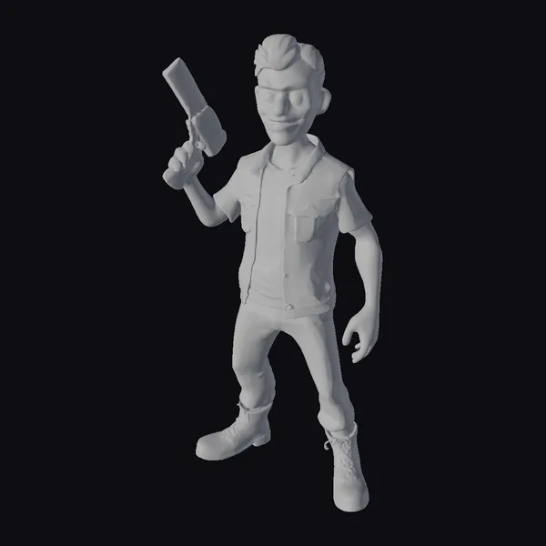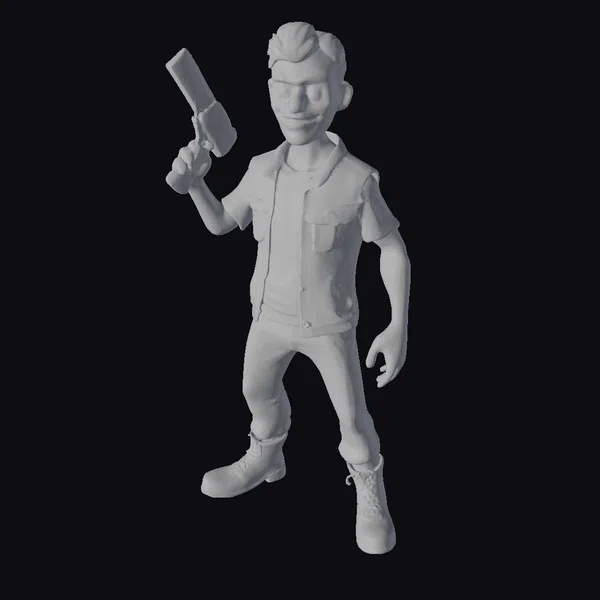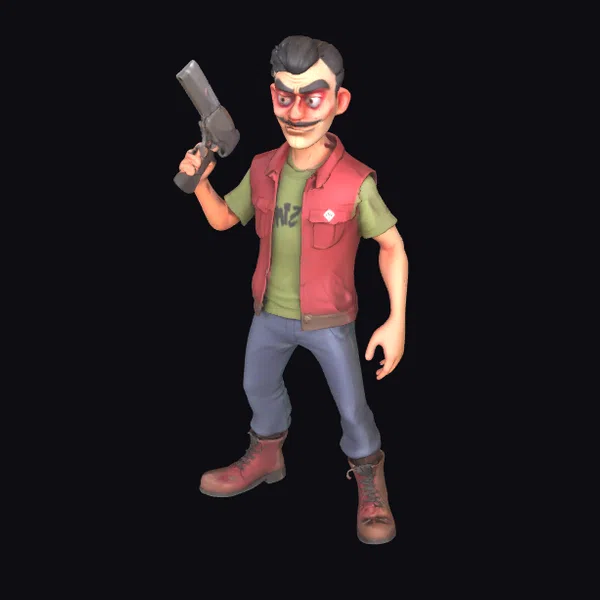 Detailed with precision, this character model showcases a unique blend of cartoonish charm and menacing intent. The psychopathic murderer stands in a dynamic pose, gun raised and expression twisted into a sly smile. His attire consists of a red vest over a green shirt with indiscernible text, paired with blue jeans and brown boots. The model’s textures and lighting accentuate its stylized features, making it a compelling addition to any project. Ideal for use in games, animations, or as a print-ready figure, this model brings a touch of dark humor and intrigue.