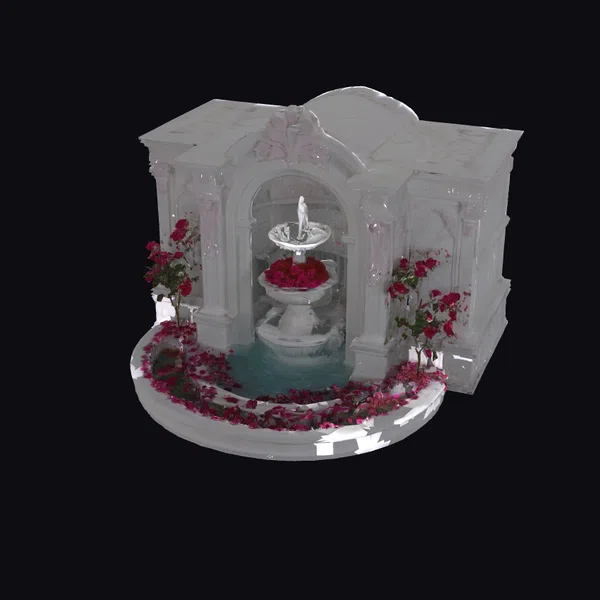 Positioned centrally within an ornate archway, the marble fountain takes center stage, showcasing its detailed craftsmanship. The structure is composed of smooth, pristine white marble, with intricate carvings of scrolling acanthus leaves adorning the archway and the base. A delicate statue tops the fountain, while the multi-tiered basin below is filled with vibrant pink roses, their petals also scattered around the base of the fountain. The pool of soft blue water at the base adds a sense of tranquility. This model is perfect for use in architectural visualizations, games, or animations where a touch of classical elegance is desired.
