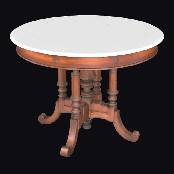Crafted with meticulous attention to detail, this stunning marble top pedestal table features a robust wooden base with ornately turned legs and a sturdy central pedestal, supporting a generous round marble top with a subtle sheen. The warm, honey-brown wood tone contrasts beautifully with the crisp white marble, evoking a sense of classic sophistication. Ideal for adding a touch of vintage elegance to games, 3D environments, print projects, VR/AR experiences, animations, or design visualizations.