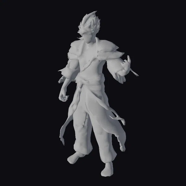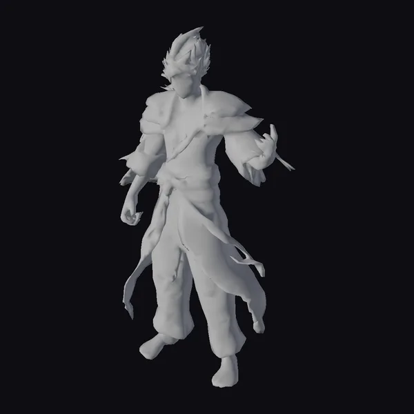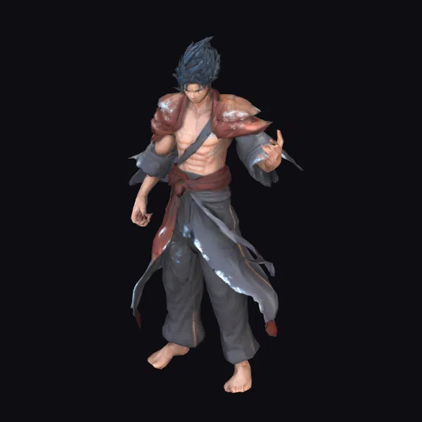 This stylized martial artist stands tall with an athletic build, showcasing a lean physique and defined muscles. His spiky hair adds to his fierce appearance, complemented by a battle-ready pose that highlights his combat skills. The character’s outfit consists of grey pants and a red and grey top, partially torn to reveal his muscular torso. The detailed textures and lighting enhance his overall appearance, making him suitable for various applications such as games, animation, and design projects. The model’s unique features and dynamic pose make it an excellent choice for creators looking for a character that embodies strength and agility.