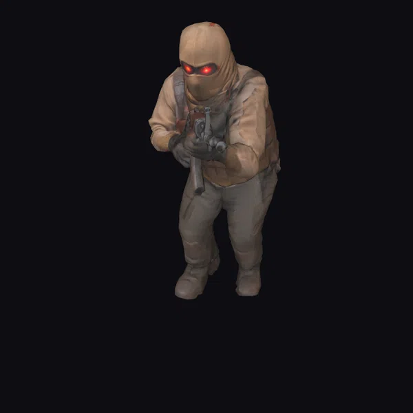 This imposing figure is captured in a dynamic crouching pose, dressed in a tan balaclava and jacket with gray tactical pants and a utility vest. The model’s face is obscured, but its red glowing eyes are unmistakable, exuding a sense of danger and urgency. The character’s gloved hands firmly grasp a gray gun, adding to the overall air of tension. The model’s realistic style and detailed textures make it suitable for use in various applications, including games, animation, and design projects where a menacing character is needed. The figure’s stance and expression convey a sense of readiness and alertness, making it a compelling addition to any 3D environment.