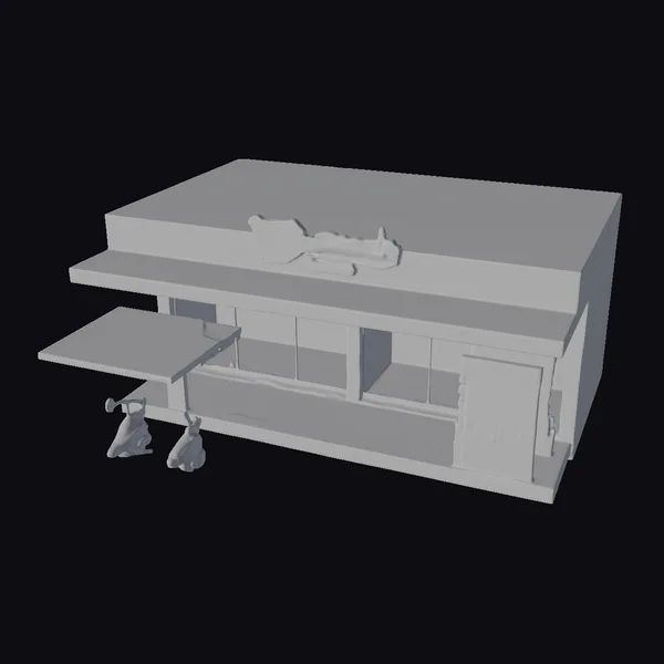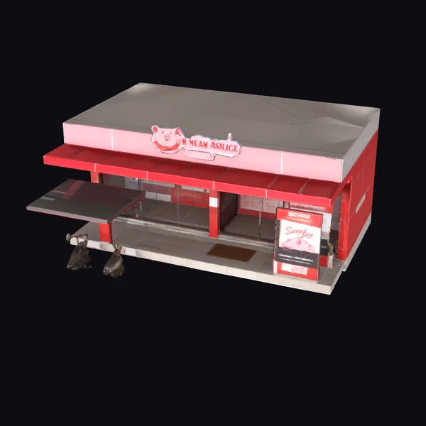 Gaze upon the dynamic exterior of this meat slice shop, complete with a partially open awning and a sign that beckons passersby. The model boasts an impressive level of detail, from the textured tiles on the sidewalk to the menu board hanging by the entrance. The red and gray color scheme is both modern and appetizing, perfect for any project requiring a fast food or restaurant setting. Designers and developers can seamlessly integrate this model into games, animations, VR/AR experiences, or architectural visualizations. The model’s balanced proportions and realistic textures ensure it will enhance any scene with its presence.