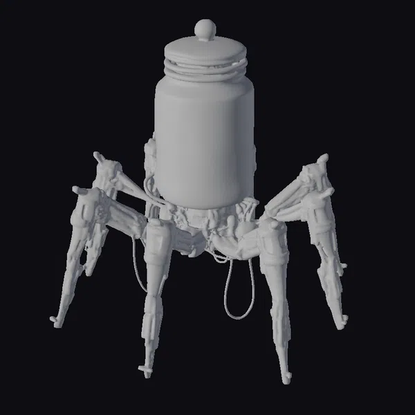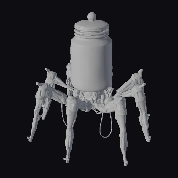 This eerie sci-fi model features a brain encased in a transparent glass jar, adorned with a glowing red light at its center, mounted on a mechanical base with six articulated legs. The jar is sealed with a glass lid, adding to the sense of foreboding. The robot’s body is a marvel of industrial design, with metallic gray limbs and visible wiring. The overall pose suggests a sense of dynamic movement, as if the robot is about to spring into action. Ideal for use in sci-fi games, animations, or designs where a futuristic, otherworldly feel is desired.