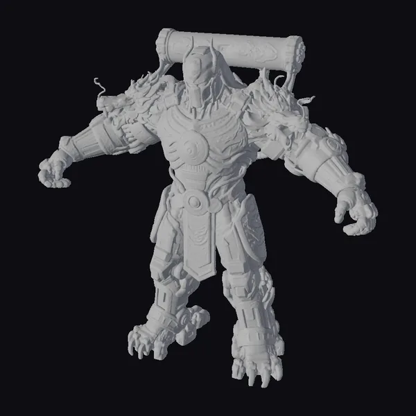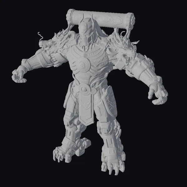 The Mechanical Dragon Guardian stands in a powerful stance, its body a marvel of mechanical and organic fusion. The armor is a mix of dark metallic tones with glowing red and blue accents, highlighting its mechanical and mystical components. A large, red scroll with golden designs rests on its shoulders, adding to its imposing presence. The guardian’s face is partially obscured by a metallic helmet, with glowing blue eyes peeking through, suggesting a blend of technology and ancient power. Its arms are outstretched, claws extended, ready for battle. This model is perfect for projects requiring a blend of fantasy and science fiction elements, such as game developers looking for unique characters, filmmakers seeking compelling creatures, or designers aiming to add a touch of sci-fi fantasy to their work.