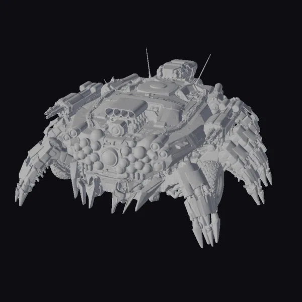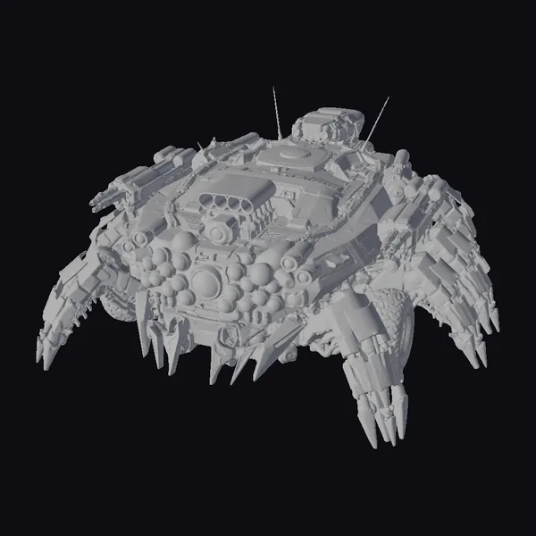 Perched on four menacing legs, each tipped with razor-sharp claws, this mechanical spider tank appears ready to pounce. The body is a complex mesh of metallic plates, adorned with antennae and an array of sensors, giving it a menacing, high-tech appearance. A central turret sits atop, suggesting a capacity for heavy firepower. The model’s surface is a mix of dark metallic tones and lighter accents, hinting at a fusion of organic and synthetic elements. The red glow of its eyes adds a sense of life, as if this machine is a living entity. Ideal for use in sci-fi games, animations, or designs requiring a futuristic, formidable presence.