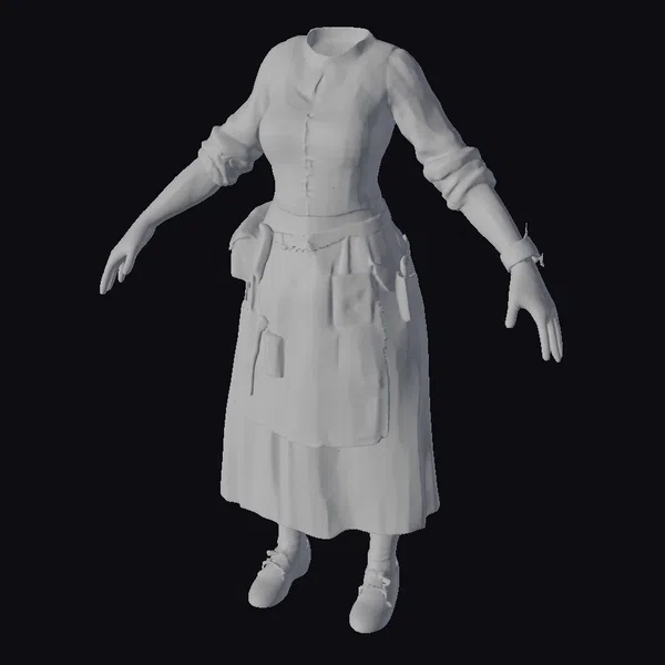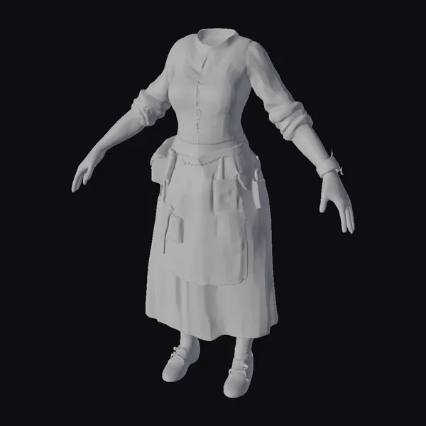 Standing with arms outstretched, this detailed 3D model showcases a medieval artisan’s attire. The outfit begins with a white blouse featuring billowy sleeves, cinched at the neck with a delicate tie. A rich brown leather vest, complete with buttons down the front, adds a touch of rugged sophistication. The sage green skirt flows elegantly, partially covered by a tan apron adorned with pockets and a leather belt. Dark brown boots and a matching belt complete the ensemble. Crafted with attention to detail, this model is perfect for projects requiring authentic medieval attire, from game development and animation to architectural visualization and design.