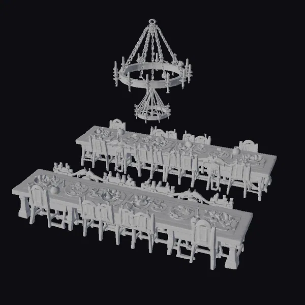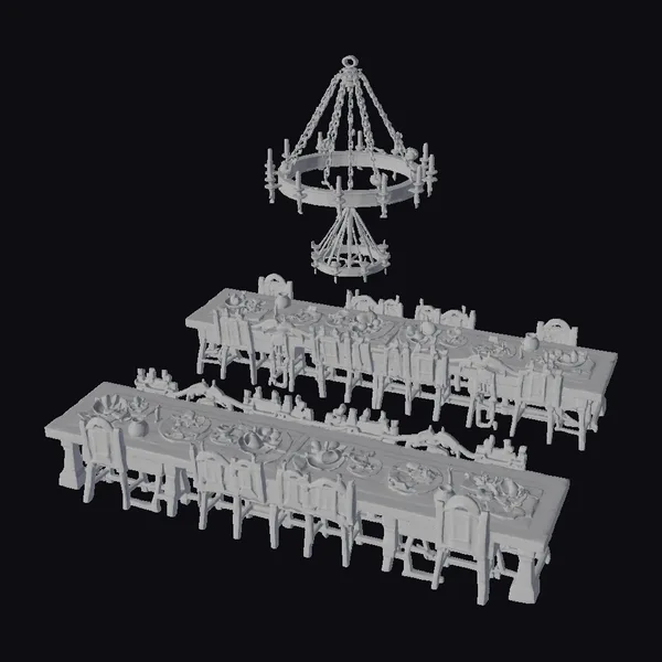 Detailed to perfection, this 3D model of a medieval banquet hall presents a lavish setting for any historical or fantasy scene. The long, wooden tables are set with an assortment of dishes, goblets, and candles, casting a warm glow across the room. Sturdy wooden chairs line the tables, while a magnificent chandelier hangs from the ceiling, adding to the ambiance. The model showcases intricate details, from the textures of the wood and the reflections on the metalware to the delicate flames of the candles. Ideal for use in games, animations, virtual reality experiences, or architectural designs, this model brings a touch of medieval opulence to any project.