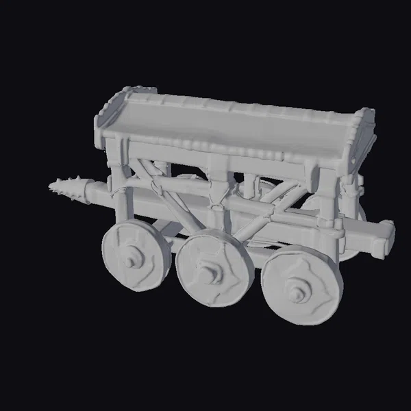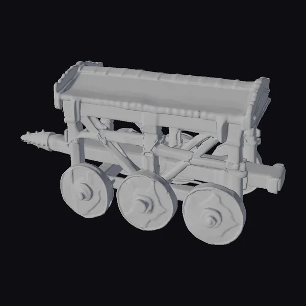 Positioned dynamically, the battering ram showcases its intricate details: the wooden beams are weathered to perfection, with metal bands and rivets adding a touch of industrial might. The spiked ram head gleams with a menacing intensity, suggesting the ferocity of medieval sieges. The three wheels, complete with wooden spokes and metal rims, are poised for action, as if ready to breach ancient fortress walls. This model is perfect for game developers, animators, and designers seeking to add a touch of historical authenticity to their projects, whether in games, animations, or architectural visualizations.