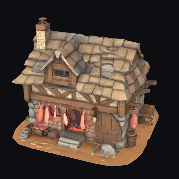 Nestled in a quiet corner, a medieval butcher house stands with its wooden door ajar, inviting you into a world of rustic charm. The roof, a mosaic of brown tiles, slopes gently, while a stone chimney rises, emitting a gentle plume of smoke. Outside, a selection of fresh meat hangs from hooks, accompanied by wooden barrels and a stone hearth with a crackling fire. The low-poly stylization brings a unique, almost storybook quality to the scene, making it perfect for projects requiring a touch of medieval flair, such as games, animations, or architectural designs.