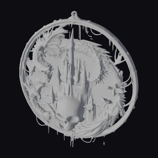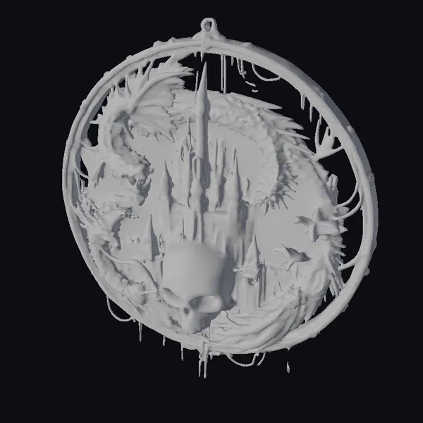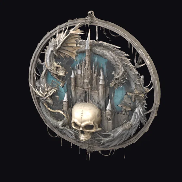 In a mesmerizing blend of dark fantasy and medieval grandeur, this intricately detailed scene presents a foreboding castle at its center, encircled by a twisted metal halo from which a dragon emerges, its body coiled around the structure. The castle itself boasts numerous turrets and spires, evoking a sense of ancient power and mystique. At the base, a skull adds a macabre touch, suggesting themes of mortality and the supernatural. The entire composition is bathed in a mysterious, blue-gray light, enhancing the enigmatic and somewhat ominous mood. This model is perfect for use in games, 3D printing, VR/AR experiences, animation, and design projects where a touch of dark fantasy is desired.
