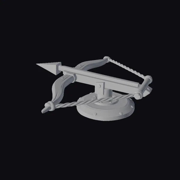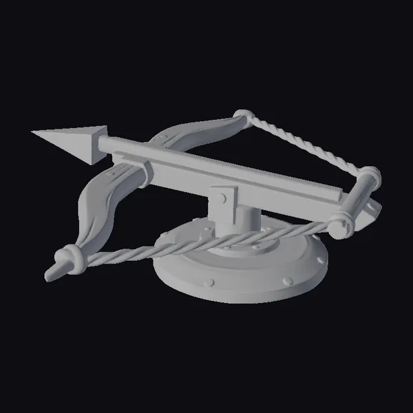 In a state of high tension, the catapult bolt rests on its wooden frame, secured by metal brackets and a twisted rope. The bolt’s metal tip glints menacingly, while the wooden components display a warm, earthy tone. The base of the catapult is a sturdy metal plate, complete with rivets and a central axis. This model is perfect for adding a touch of medieval warfare to games, animations, or architectural designs. Its stylized appearance makes it suitable for a variety of creative projects.