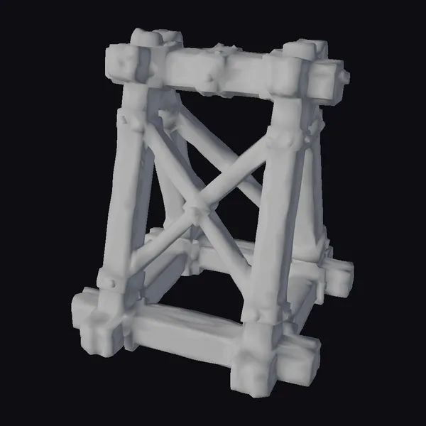 Detailed with precision, the catapult frame features a complex arrangement of wooden beams, held together by metal straps and nails. The wooden components display a realistic, weathered texture, suggesting years of exposure to the elements. The metal bindings add a touch of industrial robustness, highlighting the engineering that went into constructing such a medieval siege engine. Ideal for use in historical reconstructions, games, or animations, this model brings a piece of the past to life with its intricate details and sturdy appearance.