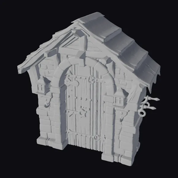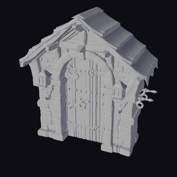 Crafted with precision, this medieval gatehouse door boasts a richly textured wooden surface adorned with heavy iron hinges and a robust locking mechanism. The door is set within a sturdy stone archway, which is illuminated by two warmly glowing lanterns mounted on either side. The structure’s roof is a masterpiece of rustic design, with overlapping wooden planks that add to the overall charm of the piece. The gatehouse’s stone walls exhibit a variety of textures, from the smoothness of the stones to the roughness of the mortar, bringing a sense of authenticity to the model. Ideal for use in games, animations, or architectural designs seeking a touch of medieval mystique.