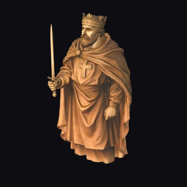 Rendered in exquisite detail, the medieval king’s robust figure exudes an aura of authority and power. His facial features are accentuated by a well-groomed beard and a crown atop his head, while his attire consists of a flowing cape draped over his shoulders and a long robe adorned with a cross on the chest. The sword in his hand appears ready for battle, adding to his imposing stance. The intricate folds of his cape and the texture of his robe are meticulously crafted, showcasing the artisan’s attention to detail. This model is perfect for use in historical or fantasy settings within games, animations, or architectural visualizations.