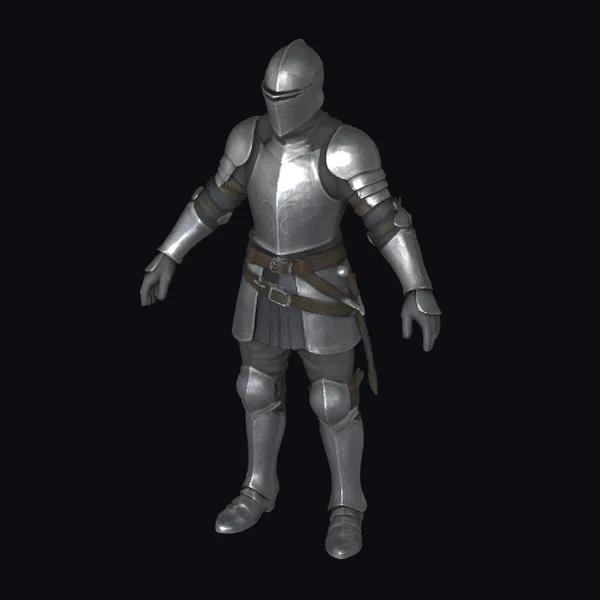In a powerful stance, the knight’s armor showcases a masterful blend of form and function. The polished silver surface reflects light, accentuating the muscular build of the knight. The armor’s design is meticulously detailed, from the articulated joints to the etched patterns on the breastplate. A sense of dynamism is captured in the slightly bent knees and outstretched arms, as if the knight is about to charge into battle. This model is perfect for use in games, 3D printing, virtual reality experiences, and animations where a realistic medieval knight is needed.