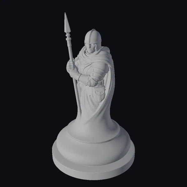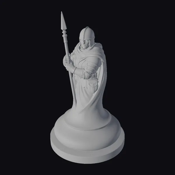 Standing proudly on a circular base, the medieval knight is captured in a dynamic pose, with his body angled slightly to the left and his gaze directed downwards. His armor, complete with a helmet and cape, is intricately detailed, with texture and shading that gives the impression of stone. The spear, held firmly in both hands, adds to the sense of readiness and vigilance. The figurine’s proportions are accurate, with careful attention to the anatomy of the face and hands. The lighting accentuates the knight’s features, highlighting the contours of his armor and the folds of his cape. This 3D model is perfect for use in games, animation, or as a printable figurine, offering a high level of detail and realism.