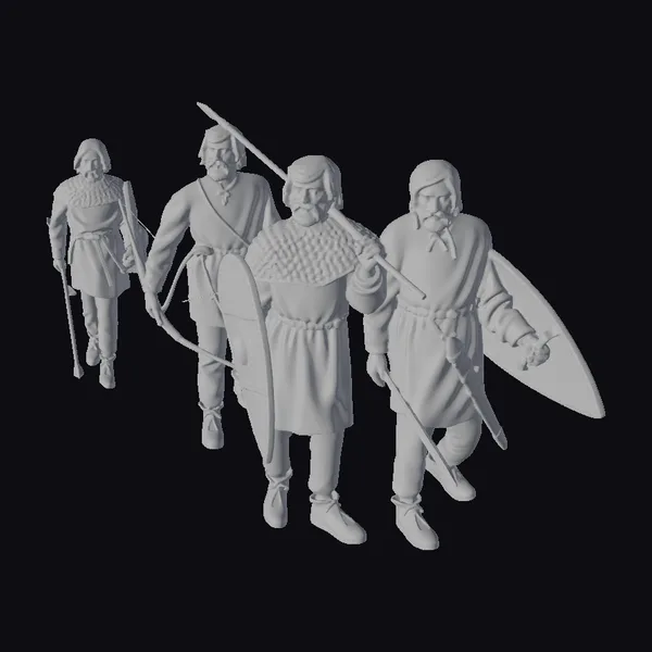 Gaze upon a quartet of medieval warriors, each uniquely posed and equipped for battle. The central figures carry large shields, with one donning a chainmail neck protector, while another wields a substantial sword. The detailed textures on their clothing, from the chainmail to the leather armor, and the realistic weaponry, transport you to the battlefields of the past. These models are perfect for historical reconstructions, animations, or game environments where realism and detail are paramount. The quality of the models ensures they can be used in high-fidelity projects, offering a genuine medieval atmosphere.