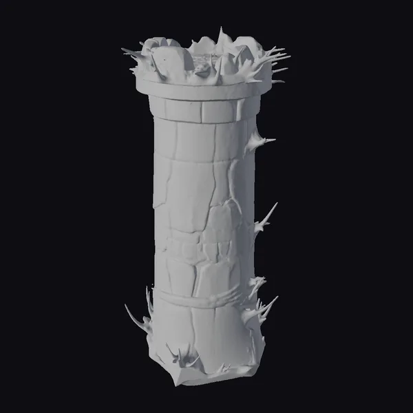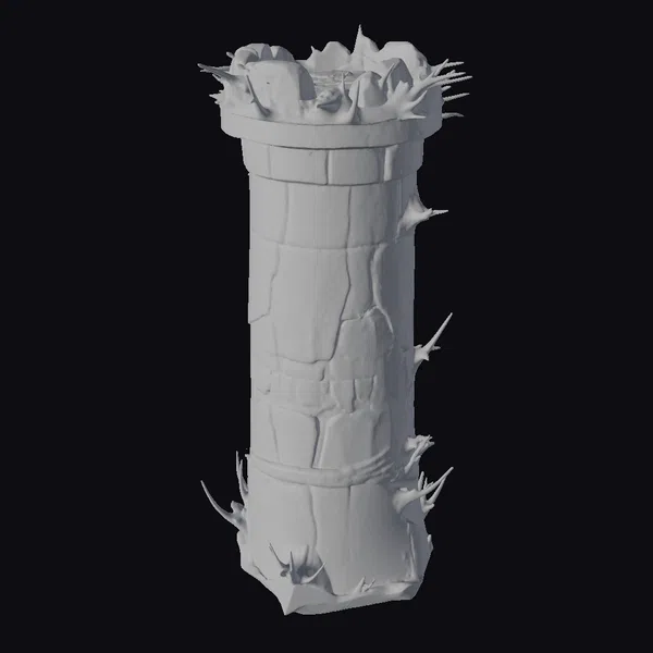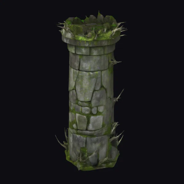 Perched precariously, this medieval stone chimney appears to be on the brink of collapse, its once-majestic form now worn down by the relentless passage of time. The surface of the chimney is a tapestry of weathered stone, with moss and lichen clinging to its nooks and crannies, imbuing the structure with a soft, emerald green hue. Jagged thorns and twisted vines burst forth from the chimney’s crumbling structure, as if nature is slowly reclaiming this ancient relic. The texture of the stone is rough and uneven, with visible cracks and crevices that speak to the chimney’s age and neglect. The moss-covered top of the chimney appears to be a haven for twisted, thorny growths, adding to the overall sense of decay and neglect. This model would be perfect for adding a touch of gothic mystery to games, 3D prints, VR/AR experiences, animations, or architectural designs.