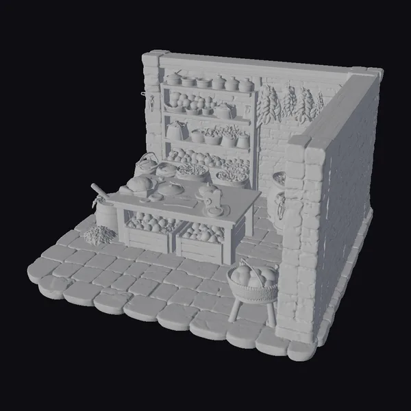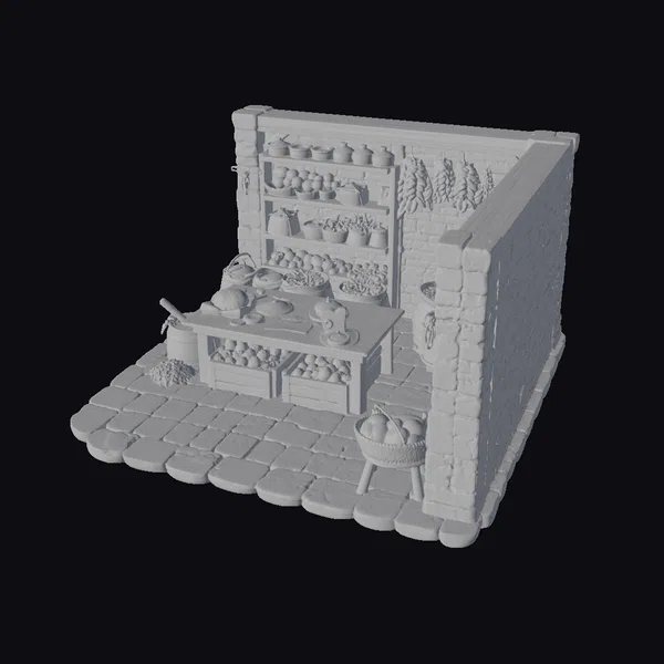 In a majestic pose, the medieval storeroom stands with its stone walls, adorned with wooden accents and warm candlelight. The rustic wooden table at its center is laden with an assortment of goods: clay jugs, woven baskets overflowing with fresh fruits and vegetables, and a variety of dishes that tell tales of a bustling marketplace. Shelves against the wall are stacked with clay pots, baskets of bread, and other food items, showcasing the abundance and richness of the storeroom. The floor, made of dark stone tiles, adds to the rustic charm, while the warm glow of candles on the shelves creates a cozy and inviting atmosphere. This detailed 3D model is perfect for enhancing scenes in games, animations, or architectural visualizations, offering a rich backdrop for storytelling and design.