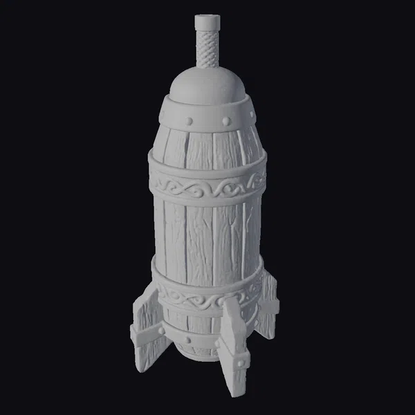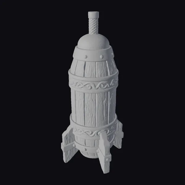 Crafted with meticulous attention to detail, this medieval stylized rocket projectile showcases a wooden body adorned with iron bands, adding a touch of ruggedness to its design. The solid fuse tip and realistic texture evoke a sense of authenticity, while its stylized appearance hints at fantastical possibilities. Standing proudly on its wooden supports, this model is perfect for games, 3D printing, VR/AR experiences, animation, and design projects seeking a unique blend of medieval charm and sci-fi flair.